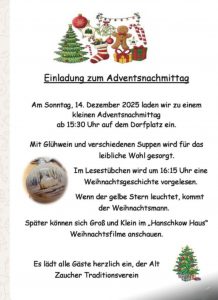 Am Sonntag, 14. Dezember, lädt der Traditionsverein Alt Zauche zu Glühwein und heißer Suppe ein. Ab 15.30 Uhr sind alle eingeladen, die gern andere Leute treffen, plaudern und gemeinsam die Adventsstimmung genießen wollen. Auch auf die Jüngsten warten einige Überraschungen.
