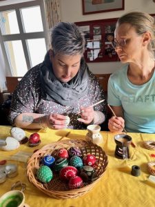 Das sonnige Wetter zu Ostern lockte Urlauber und Einheimische in die Natur. Aber auch das Angebot des Traditionsvereins, Ostereier zu verzieren wurde wieder gut angenommen. Vor allem am Nachmittag waren alle Plätze in der Osterwerkstatt besetzt, um bunte Eier zu gestalten. Brigitte hatte Unterstützung von Tochter und Enkelinnen, um den kreativen Gästen die Techniken zu erklären. Ob Punkte, Striche oder Kreise – der Phantasie waren keine Grenzen gesetzt. Natürlich gab es auch wieder den traditionellen Osterzopf als Stärkung. DANKE den fleißigen Helfern!