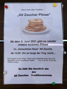 Jeden Dienstag duftet es wieder herrlich nach den beliebten Plinse. Im HanschkowHaus (Dorfmitte) bäckt der Traditionsverein ab 14 Uhr für Touristen, Gäste und Einheimische die Leckerei.
